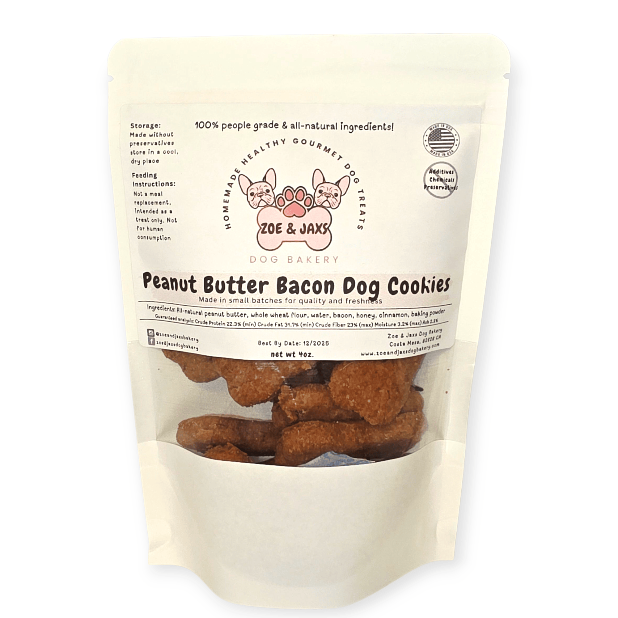 Ingredients: Whole wheat flour, natural peanut butter, water, bacon, cinnamon, baking powder